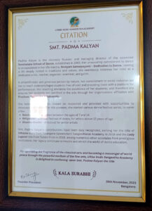 పద్మ ఇద్దరు పిల్లలతల్లి.పాపకి రెండవనెల.కానీ మనసు డాన్స్ చుట్టూ తిరుగుతూ ఉంటే కూచునే జావళీలు క్షేత్రయ్య పదాలు ఆధ్యాత్మ రామాయణం కీర్తనలు ప్రాక్టీస్ చేశారామె.భర్తకి టెలిఫోన్ శాఖలో జాబ్.అక్కడ సరిదె మాణిక్యమ్మ గారు అనే దేవదాసి వద్ద ఇవి నేర్చుకున్నారు.1984 లో కూచిపూడి లో వెంపటి చినసత్యం గారు స్టైఫెండ్ తో శిక్షణా తరగతులు ప్రారంభించారు.కానీ ఈమె కి తెలిసి డేట్ ఐపోటంతో ఓగది అద్దెకి తీసుకుని ఇద్దరు పిల్లలతో ఉదయం 8_ నుంచి రాత్రి 8 దాకా పనులు డాన్సుసాధన చేశారు.మాపాపకి డాన్స్ నేర్పిస్తూ ఆమె తో నేను కూడా ప్రాక్టీస్ చేసేదాన్ని.టీచింగ్ సైడ్ వెళ్లడంకోసం శిక్షణ తీసుకున్న ” అని తన అనుభవాలను చెప్పారు ఆమె” క్రమంగా పిల్లలకి ట్యూషన్ చెప్తూ వారు సర్టిఫికెట్ కోర్సు మొదలు డిప్లొమా దాకా నాదగ్గర పాసైన వారున్నారు.15 బాలేలు 60_70 దాకా సోలో నృత్యాలు ఆతర్వాత వివిధ స్కూళ్ళలో డాన్స్ టీచర్ గా మంచి పేరు గుర్తింపు తెచ్చుకున్నాను.నాదగ్గర నేర్చుకున్న వారు ఎందరో జాతీయ అంతర్జాతీయ స్థాయిలో గుర్తింపు పొందటం నాకు సంతోషం.మా అమ్మాయి డిప్లొమా పాసైంది.స్వరాలయ నృత్యోత్సవ బాలోత్సవ్ అన్నింటా ఈమె శిష్యులు ఫస్ట్ ప్రైజులు తెచ్చుకున్నారు.కళాతపస్వి అవార్డు కూచిపూడి జీవన సాఫల్య కళాకార్ బుక్ ఆఫ్ వరల్డ్ రికార్డ్స్ ఇలా ఎన్నో ఎన్నెన్నో నాఖాతాలో ఉన్నాయి.ప్రభుత్వబడులలో పిల్లలకి శిక్షణ ఇవ్వాలి అని నాకోరిక.కానీ అది నెరవేరలేదు.” నిజంగా ఆమె చెప్పిన మాటలు ఆశ్చర్యం కల్గిస్తాయి.భర్త పిల్లలు సహకారం తో ఆమె తన కోరిక కలనెరవేర్చుకోటం అద్భుతంగా అనిపిస్తోంది కదూ!?