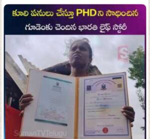 ఇన్ని కష్టాల మధ్యా భారతి డిగ్రీ, పీజీ మంచి మార్కులతో పూర్తిచేసింది. అది చూసి భర్త, టీచర్లూ పీహెచ్‌డీ దిశగా ఆలోచించమన్నారు. ప్రయత్నిస్తే ప్రొఫెసర్‌ డా.ఎంసీఎస్‌ శుభ దగ్గర ‘బైనరీ మిక్చర్స్‌’ అంశంపై పరిశోధనకు అవకాశం లభించింది. ఇందుకోసం వచ్చే ఉపకార వేతనం భారతికి కొంత సాయపడింది.అయినా తను కూలి పనులు మానలేదు.