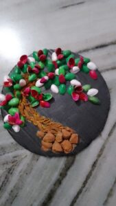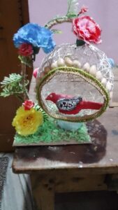 పిస్తా షెల్స్, గట్టి అట్టముక్క, ఫెవికాల్, ఎండుగడ్డి, గ్రీన్ కలర్, క్లే బర్డ్స్, ప్లాస్టిక్ పూలు, ప్లాస్టిక్ స్టిక్స్ కింద కేక్ ప్లేట్!