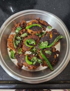 చల్లారిన తరువాత వీటిని కొబ్బరి ని పొడి చేయాలి. ఈ పొడిలో అల్లంవెల్లుల్లి పేస్ట్, అన్ని పొడులు, కాస్త నూనెలోవేయించిన ఉల్లి ముక్కలు వేసి కొన్ని నీళ్లు పోసి ముద్దగా పేస్ట్ చేసుకోవాలి. కారం, ఉప్పు రుచి చూసి అవసరమైతే మీకు తగినంత కలుపుకొని బాగా కలిసేలా మిక్సీ పట్టాలి .దీనిలో నిమ్మరసం కలిపి చేప ముక్కలకి పట్టించాలి.స్టవ్ పై పెనం పెట్టి వేడెక్కాక 200గ్రామ్స్ లో సగం 100గ్రామ్స్ నూనె పోసి, మంటని మీడియం చేసి,సగం చేప ముక్కలను ఒక్కొక్కదానికి పేస్ట్ బాగా పెట్టుకుంటూ నూనెలో పెట్టాలి. ముక్కలకి పైన వైపుకూడాపేస్ట్ బాగా పెట్టాలి. దీనిపై ఒక మూత బోర్లించి పెట్టి 3,4నిముషాలు ముదురు బంగారు రంగు వచ్చేలావేయించి, మూత తీసి మరోవైపు తిరగేయాలి. ఇప్పుడు మూత పెట్టకూడదు. రెండోవైపు కూడా మంచి రంగు వచ్ఛేలా వేయించి తియ్యాలి. ఇప్పుడు మళ్ళీ మిగిలిన ముక్కలను కూడా ఇలాగే వేయించాలి. మసాలాని అన్నంలో కలుపుకొని తింటూ, చేప ముక్కలను మధ్య మధ్య లో నంజుకొని తింటూవుంటే, ఆహా ఓహో అదరహో అన్నట్టుంటుంది. మీరు వండుకొని తిన్నాక ఎలా ఉందో చెప్పండి. ఒక మంచి వంట మీకు పరిచయం చేసానన్న తృప్తి నాకుంటుంది.