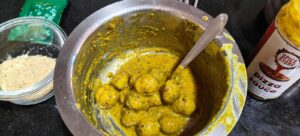 ఇప్పుడు దాన్ని చల్లార్చనిచ్చి అందులో చిన్న గ్లాస్ నువ్వుల పొడి అంతే సమానంగా ఉప్పు, ఆవాల పొడి, కొంచెం జీలకర్ర మెంతిపొడి వేసి బాగా కలిపి, నూనె కాచి చక్కగా ఇంగువ వేసి పోపు వేయండి.