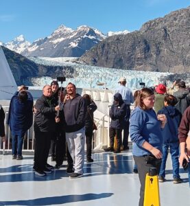 ఉంది. కరెక్ట్ గా ఈ Humpback Whale అనే తిమింగలం సముద్రంలో లేస్తే ఎలా వాటర్ దాని చుట్టుపక్కల పడుతుందో అలాగే రూపొందించారు .చాలా బ్యూటిఫుల్ గా ఉన్నది అక్కడి నుంచి మళ్లీ ఇంకా టైం ఉందని గ్లేషియర్ బస్ టూరిస్ట్ ట్రావెల్స్ దగ్గర నాకు పరిచయమైన ఆమె దగ్గరికి వెళ్ళాము.” మాకు టైం ఉంది . నెక్స్ట్ఇంకా ఎక్కడెక్కడడికి వెళ్లొచ్చు”. అని సలహా అడిగాం.ఆమె ఉబర్ తీసుకొని వెళితే 15 మినిట్స్ పడుతుందని ఒక ప్లేస్ చెప్పింది.అది గ్లేషియర్ గార్డెన్స్ .ఇది ఒక బొటానికల్ గార్డెన్ .కరెక్ట్ గా 15 నిమిషాల్లో బొటానికల్ గార్డెన్ కు వెళ్లాం. అక్కడ ఒక పెద్ద వ్యాన్ లాంటిది ఉంది. రెండు పక్కలా ఓపెన్ ఉంది. దానిలో కూర్చొని టూర్ చేశాము.ఈ బొటానికల్ గార్డెన్స్ చాలా చాలా బాగుంది .అందంగా ఉన్నది . నిజంగా ఎంత అందంగా ఉందో వర్ణించలేను .ఇదంతా ఆర్టిఫిషియల్ గార్డెన్స్ .కానీ కలర్ కాంబినేషన్స్, ఫ్రేమింగ్ అండ్ ఫిక్సింగ్ ఫ్లవర్స్ అత్యద్భుతం. ఒక దగ్గర హ్యాంగింగ్ గార్డెన్ కూడా ఉంది. పూర్తిగా Rain Forest theme . ఫారెస్ట్ లోకి పైకి వెళ్లి చూపించారు. రకరకాల పువ్వులే కాకుండా రకరకాల ఆకులు కూడా చాలా అందంగా ఉన్నాయి. పైకి వెళ్తుంటే ఫన్ అండ్ అడ్వెంచర్ లాగా అనిపించింది. ఇంకా పైకి వెళ్లాక టూర్ బస్ ఒక ప్లేస్ లో ఆపేశారు. అక్కడి నుంచి కొన్ని అడుగులు పైకి నడుచుకుంటూ వెళ్లి కిందికి చూస్తే ఒక చిన్న ఎయిర్పోర్ట్ కనిపించింది. బొటానికల్ గార్డెన్స్ నుండి మళ్లీ cruise వద్దకు వచ్చాము.cruise బయలుదేరడానికి ఇంకా గంట టైం ఉంది. అలా వాటర్ ఫ్రంట్ దగ్గర ఉన్న ఉడెన్ బ్రిడ్జి పైన నడుస్తూ కిందికి దిగేసరికి sea shore కనిపించింది. కొంచెం సేపు అక్కడ టైం స్పెండ్ చేద్దామని వెళ్ళాము. కానీ 10 నిమిషాల కన్నా ఎక్కువగా ఉండలేకపోయాం. నాచు వాసన ఉందక్కడ .క్రుచ్షిప్ యజమానులు వాళ్ళ స్పోర్ట్స్ దగ్గర ఎప్పటికప్పుడు శుభ్రంగా ఉంచుతారు. కొన్ని ప్రైవేటు బీచ్ వాళ్లు నాచు తీసేసి వాసన లేకుండా చేస్తారు. కానీ ఇది ఓపెన్ beach. వాసన ఉంది వెంటనే అక్కడి నుంచి తిరిగి cruise వద్దకు వచ్చేసాము.నాచును ప్రాసెస్ చేసి రకరకాల వంటల్లో వేస్తారట. హెల్త్ కు చాలా మంచిదట. టైప్ టు డయాబెటిస్ ను తగ్గిస్తుంది. చెడు కొలెస్ట్రాల్ ను తగ్గిస్తుంది. జపాన్ వంటల్లో ఇది ఎక్కువగా వాడుతారు. జపాన్ వంటల్లో ముఖ్యమైన వంటకం పేరు “సుశి.” ఈ వంటకంలో ఈ “sea wead ” ను ప్రాసెస్ చేసి, లోపల రైస్ ఉంచి సివీడ్ లో ర్యాప్ చేస్తారు. అలా ఆ రోజంతా తిరిగి తిరిగి అలసిపోయి క్రూజ్ లోకి వెళ్ళగానే సిబ్బంది చిరునవ్వుతో టీ కాఫీ ఫ్లేవర్ మిల్క్ లతో ఆహ్వానించారు . రూమ్ కి చెక్ చేసి చేశారు రూమ్లో రెస్ట్ తీసుకొని రేపు ఉదయం గ్లేషియర్ బె అండ్ సి మొత్తం ప్రయాణం ఎల్లుండి ఉదయం వరకు ఈరోజు సిక్స్త్ డే ఈరోజు అంతా పసిఫిక్ మహాసాగరంలో మధ్యలో ప్రయాణం ఆరవ రోజుల